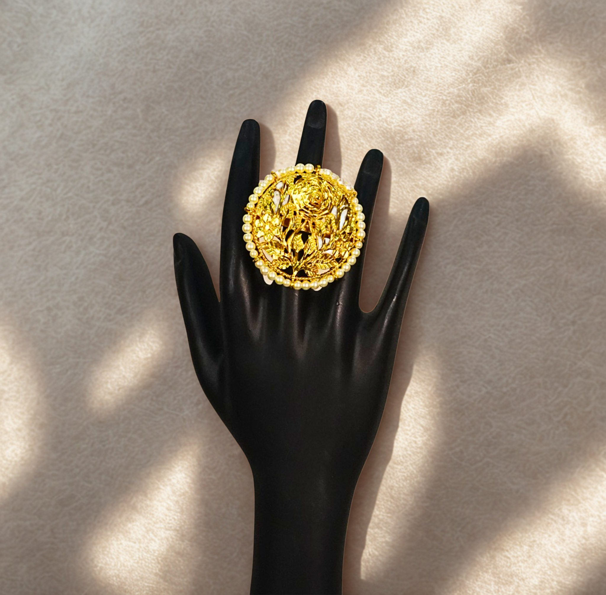 24k gold-plated - floral motif adjustable cocktail finger ring with pearl border