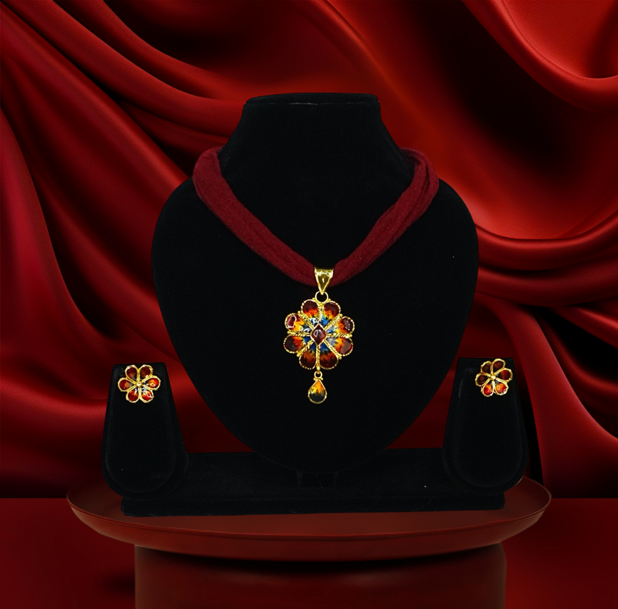 Vibrant floral meena pendant set – 24k gold-plated with earrings