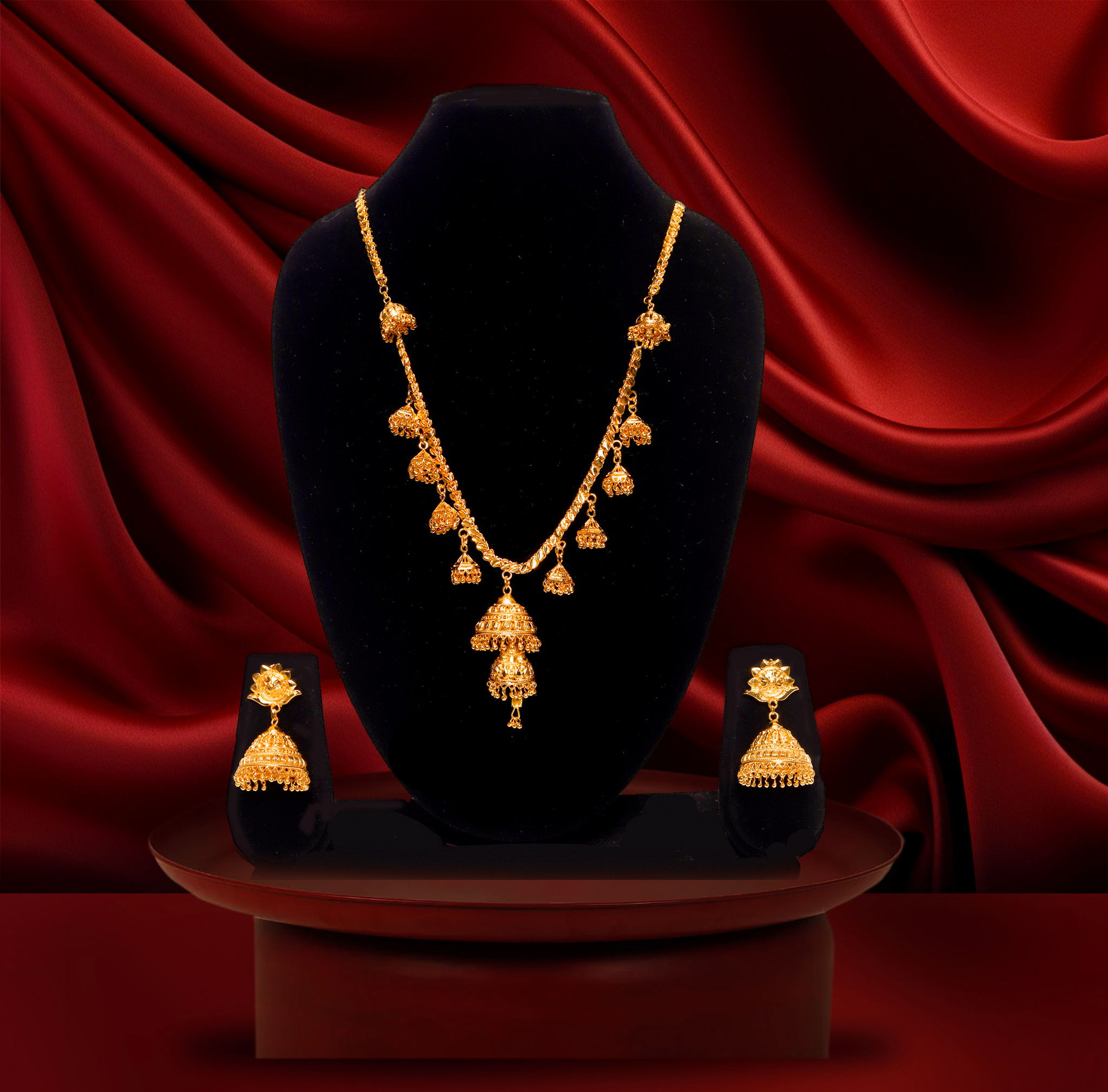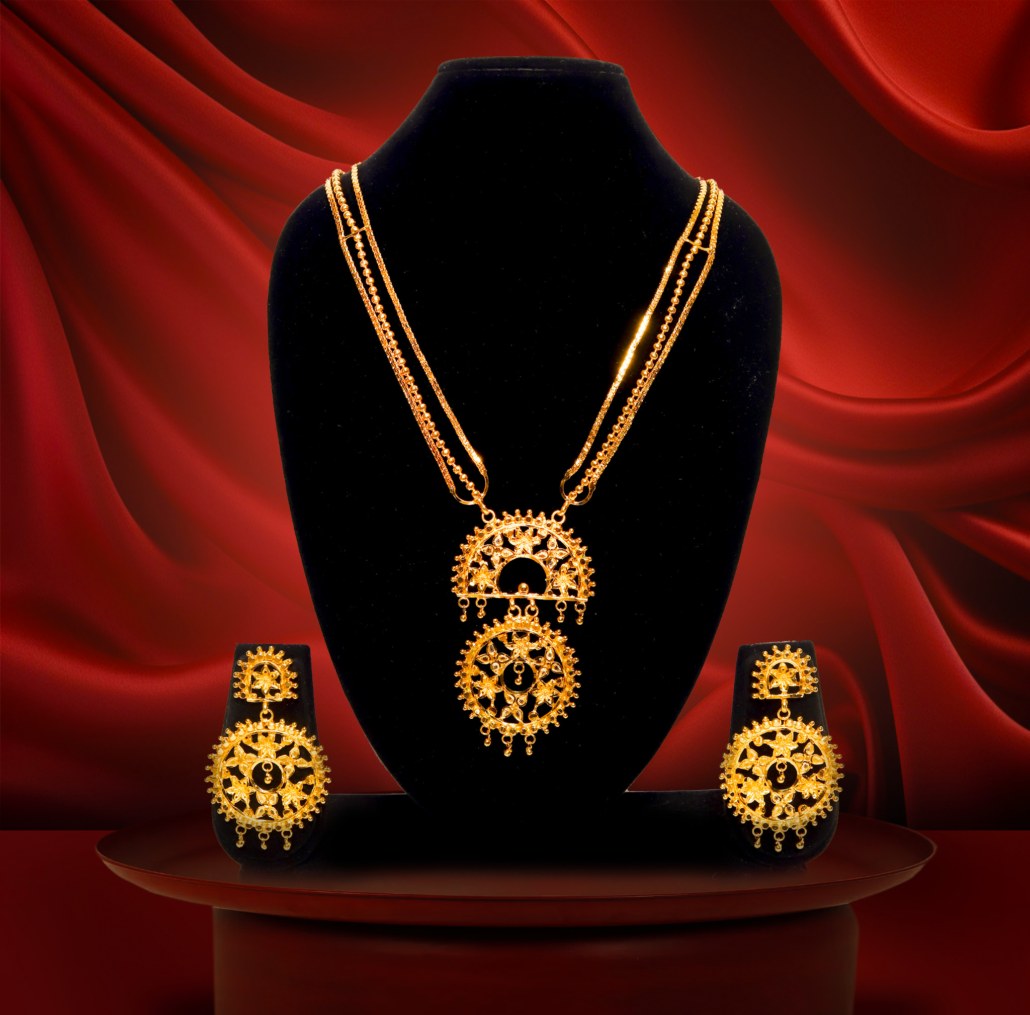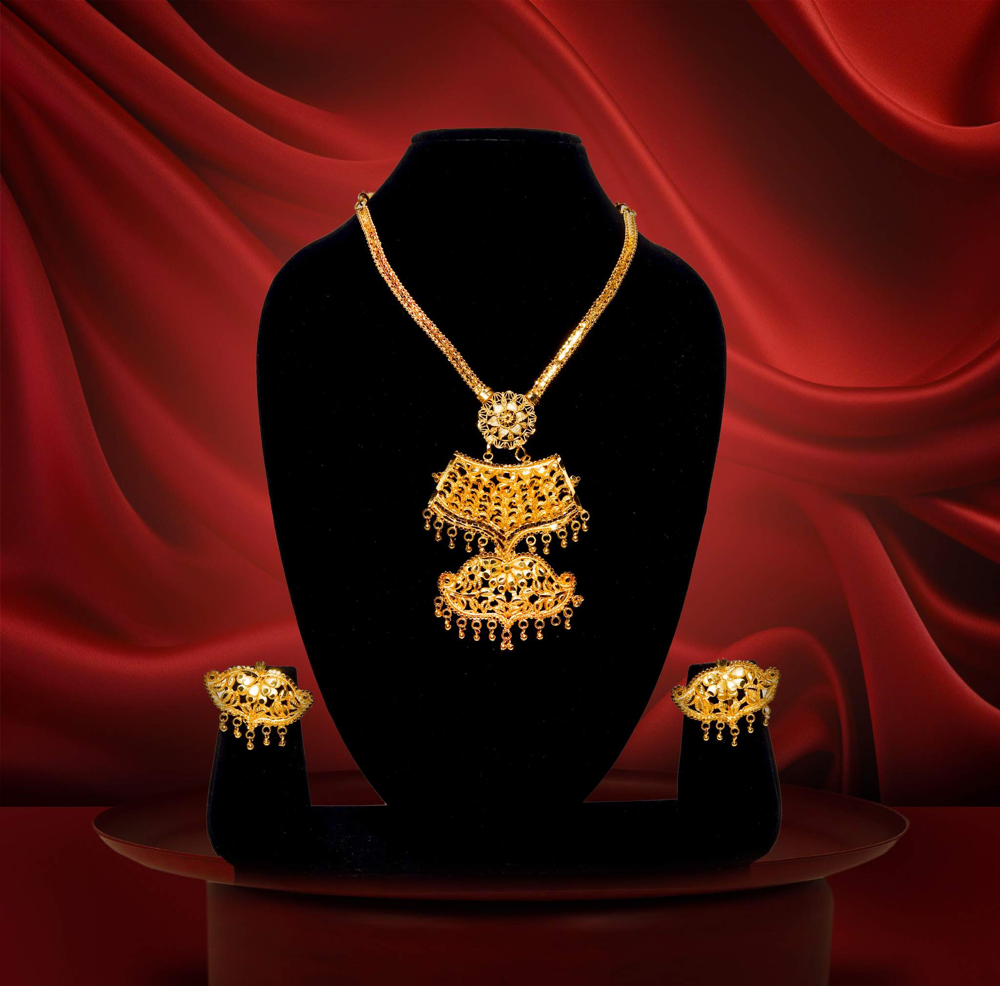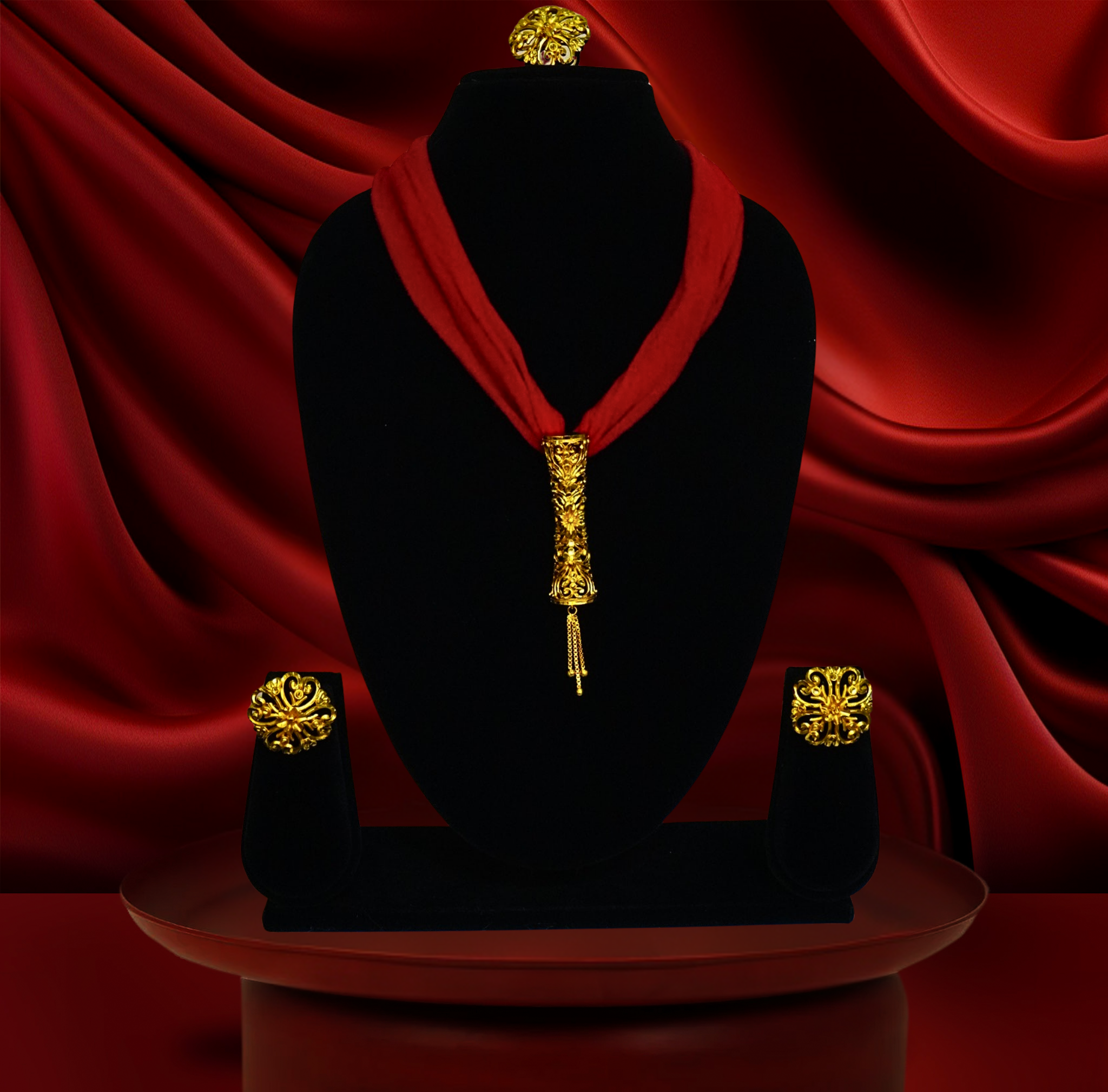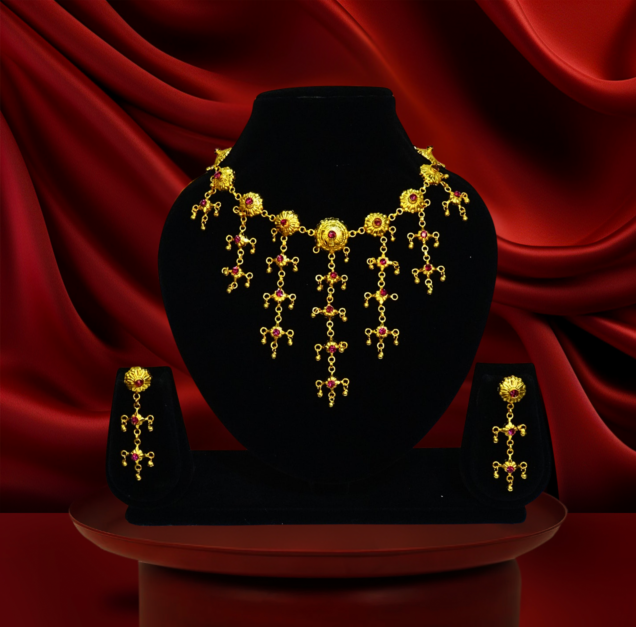 Traditional sabeki jhalor necklace come chokher set – 24k gold-plated with ruby stone detailing