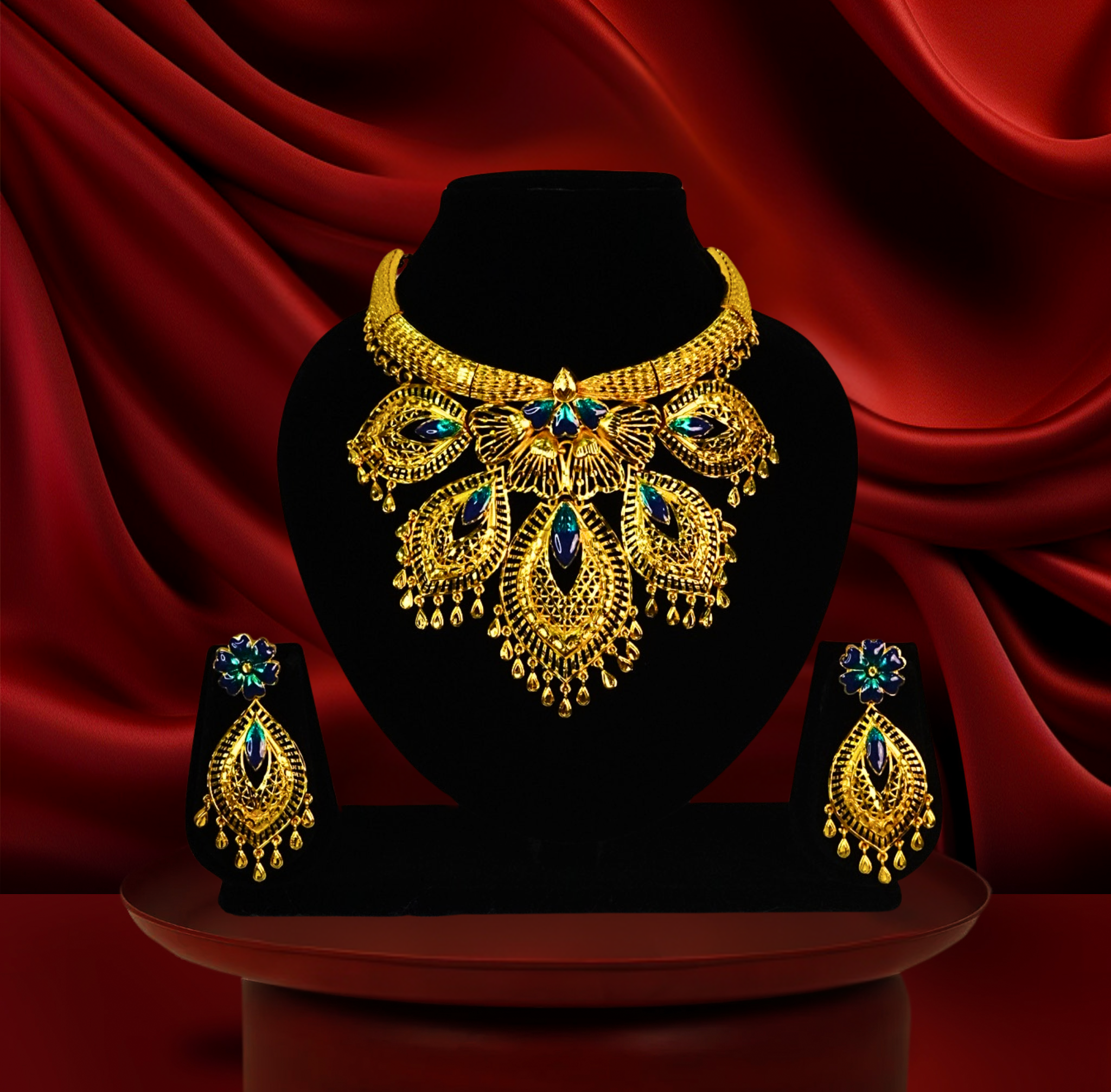 Rs. 5,550.00Rs. 5,550.00 Rs. 7,299.00/Unleash your inner queen with our handcrafted 24K Gold-Plated Peacock Feather Inspired Heavy Necklace Set. This Bridal Choker set inspired by traditional Indian craftsmanship, a true celebration of timeless...