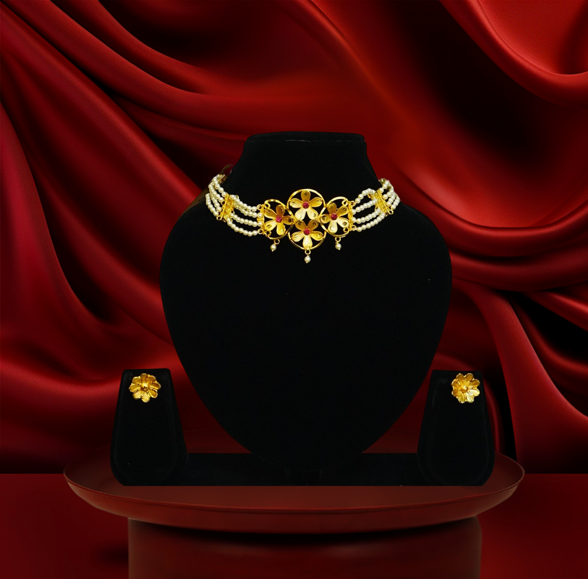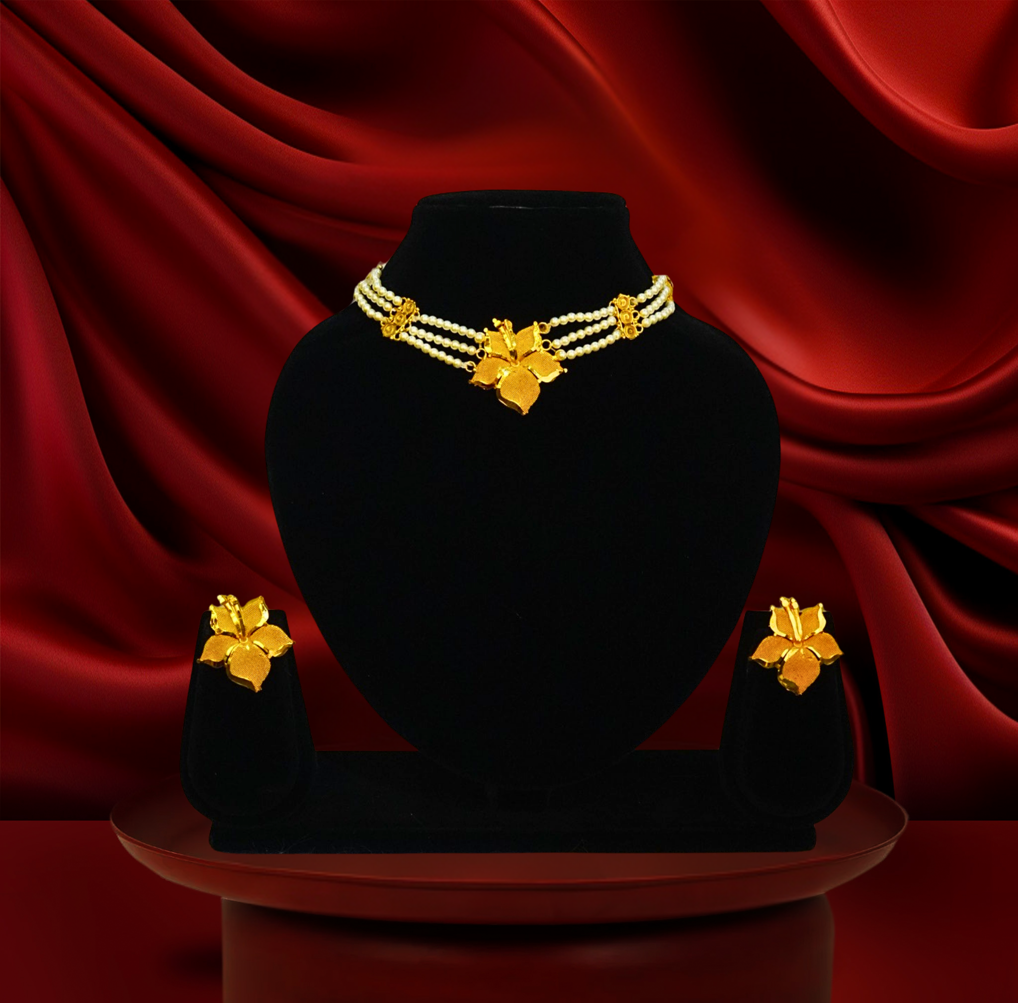 Floral bloom pearl choker set – 24k gold-plated pearl choker with earrings