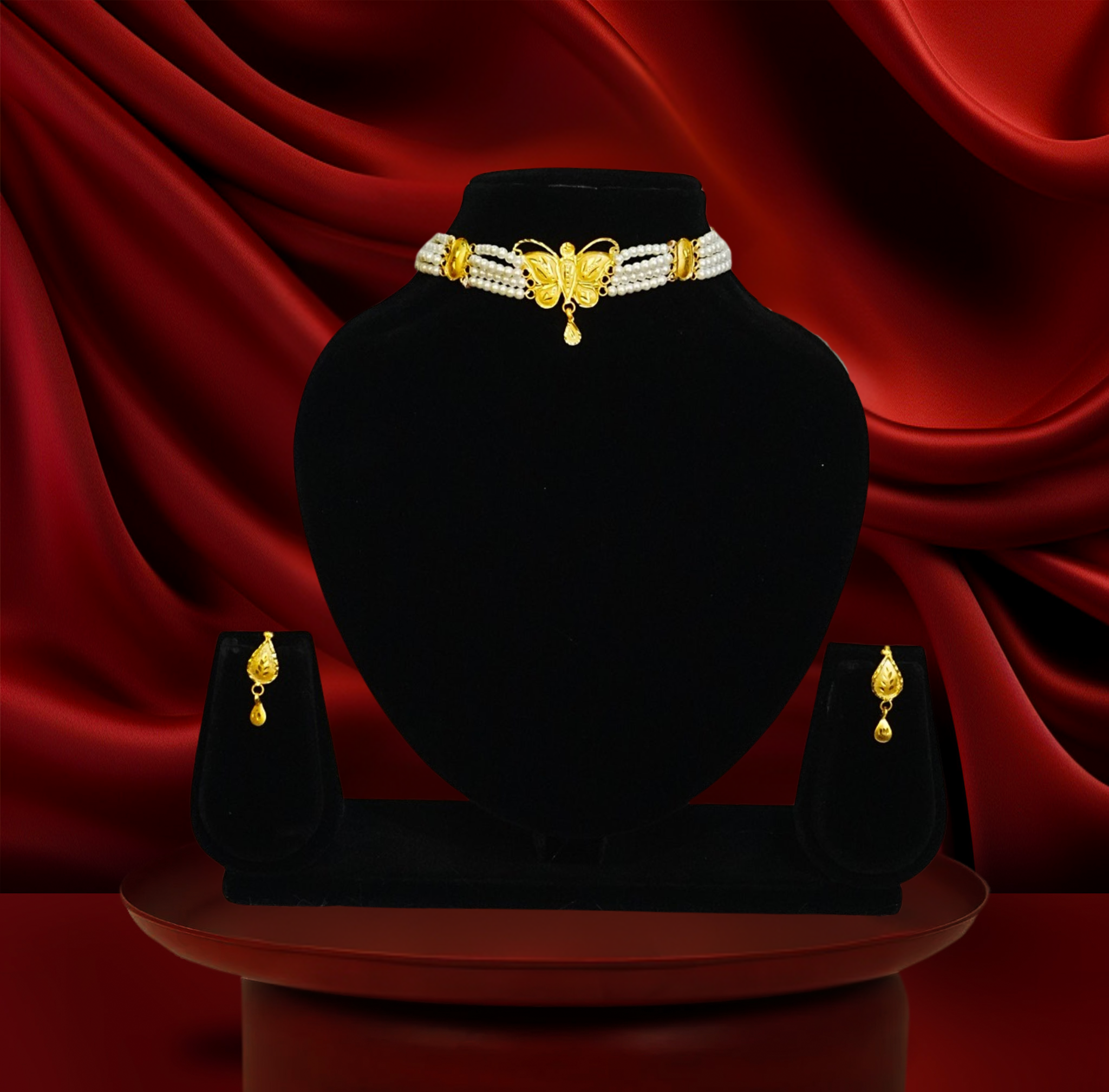 Butterfly pearl choker set – 24kt gold-plated with earrings