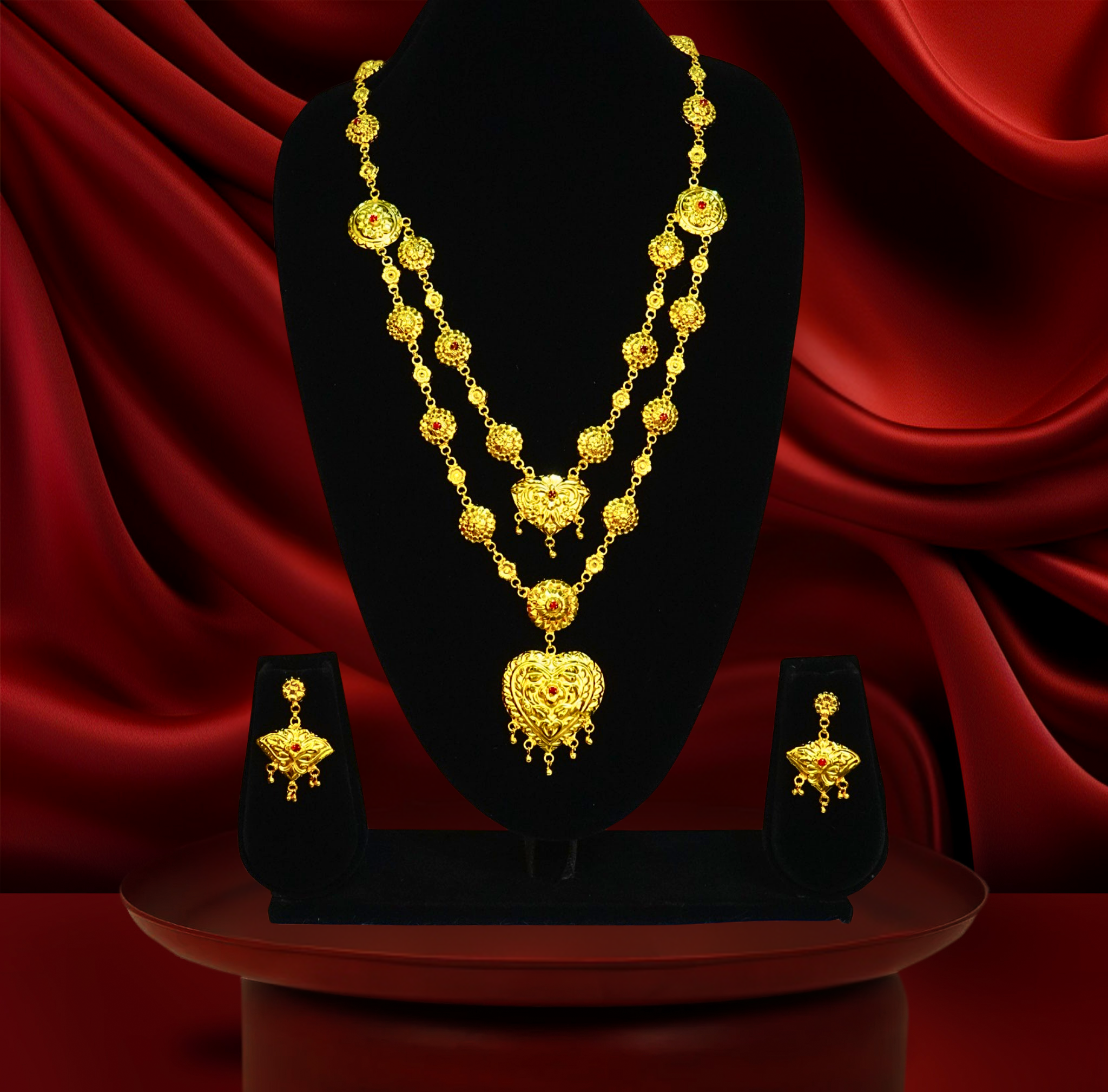 24k gold-plated sabeki double layer heart motif bridal necklace set – red stone accents
