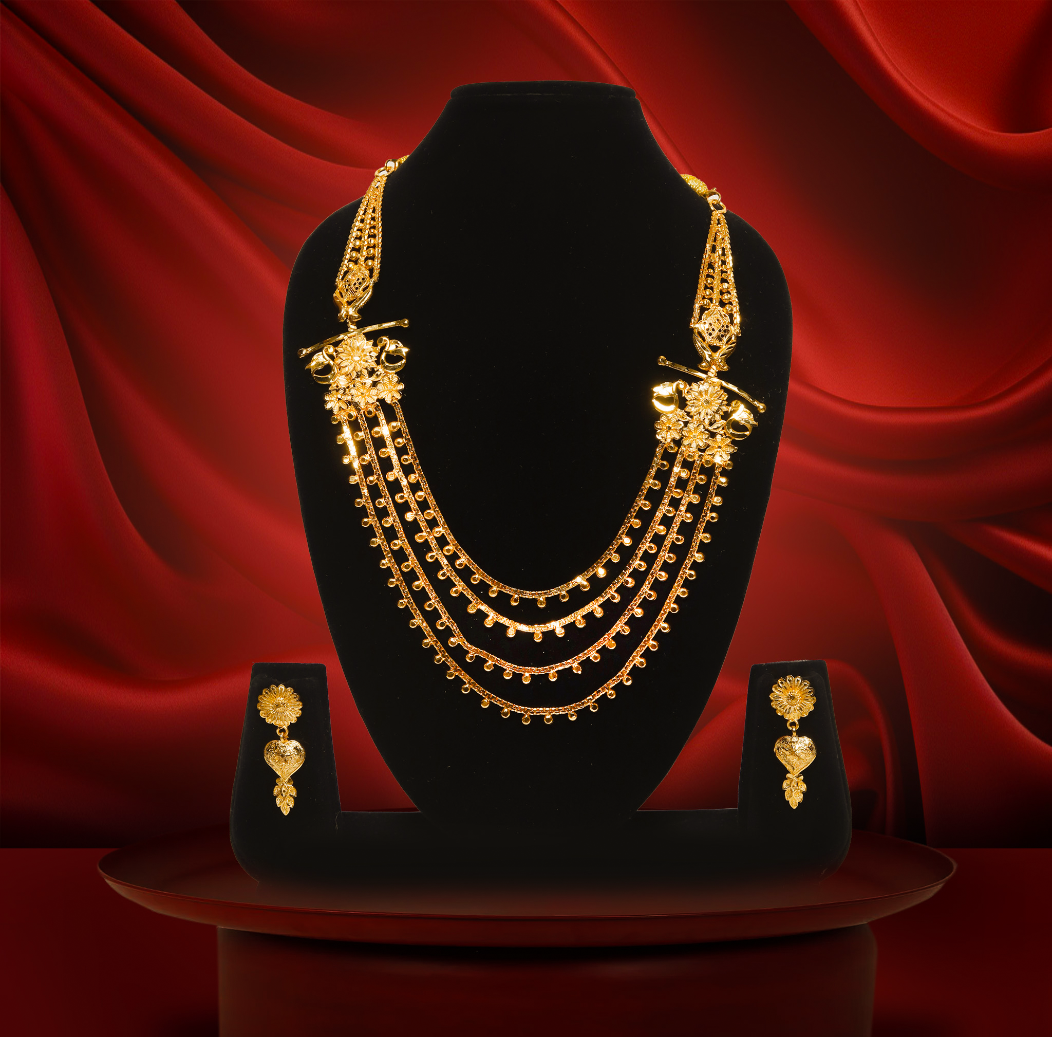 3-layer pearl butterfly pattern lohori set – 24k gold-plated bridal jewellery with earrings