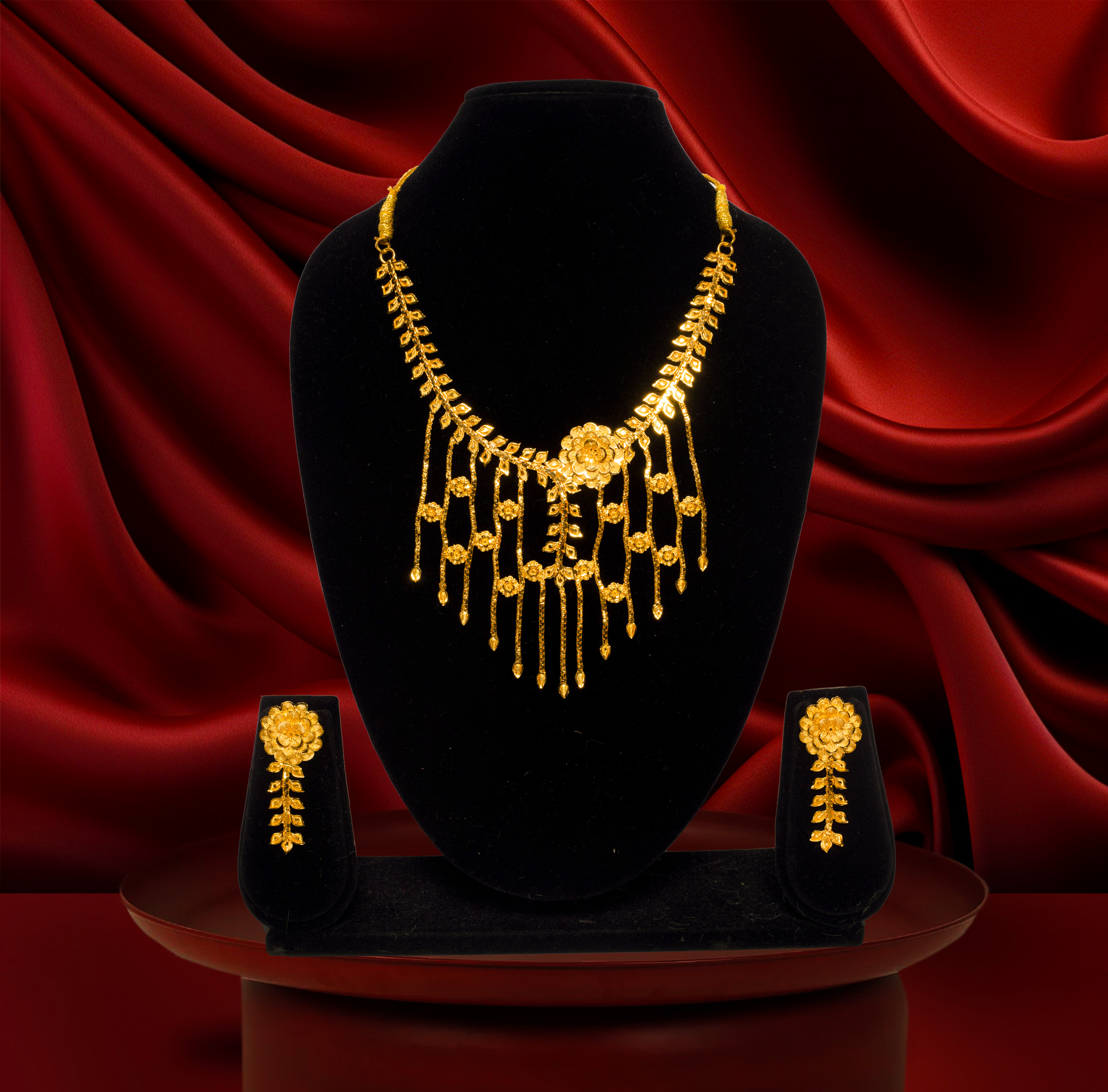 Unleash your inner queen with our handcrafted 24K Gold-Plated Bridal Chatai Design Floral Necklace Set. This luxurious bridal jewelry set inspired by traditional Indian craftsmanship, a...