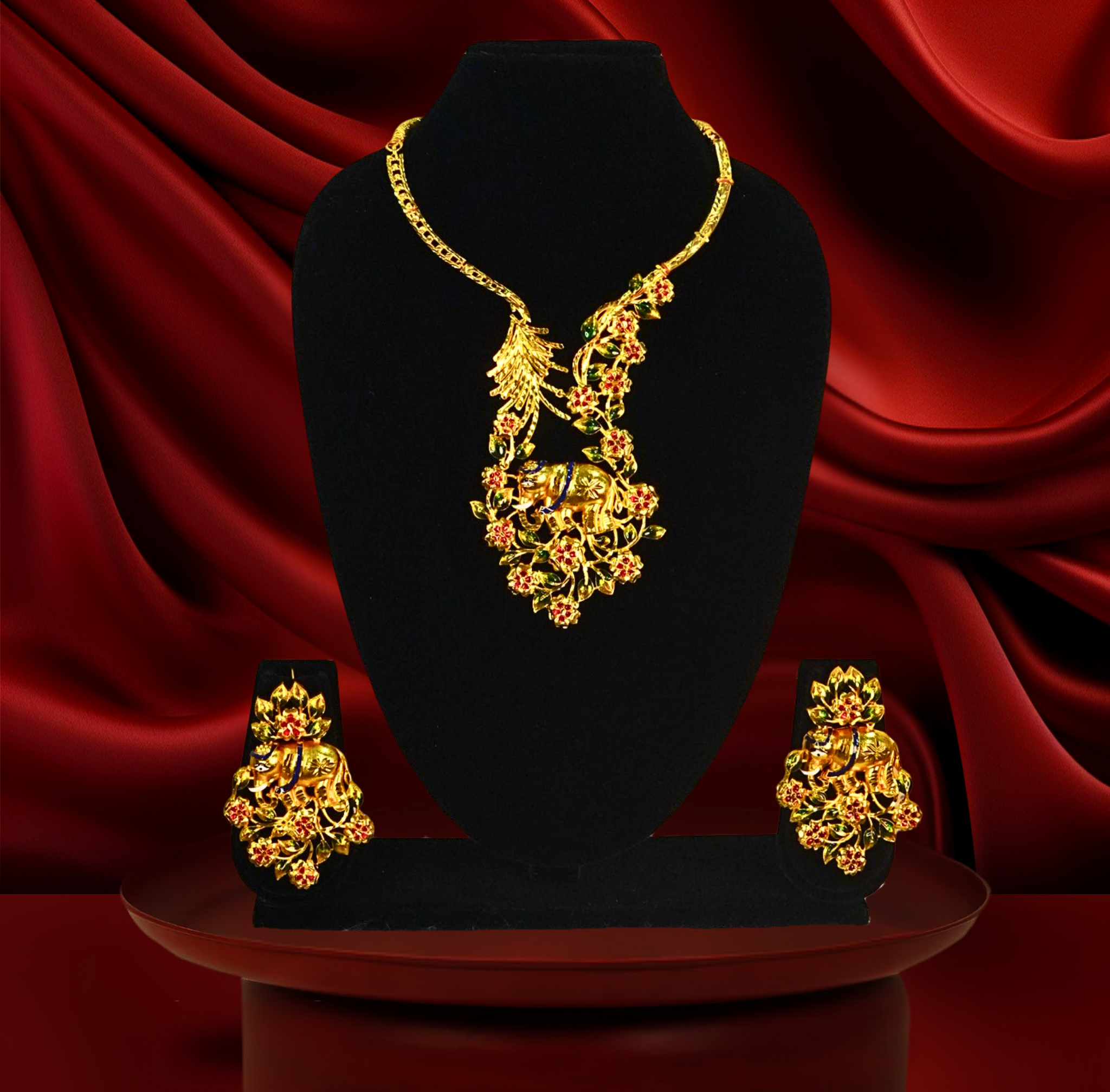24k gold-plated elephant motif statement necklace set with floral detailing & matching earrings