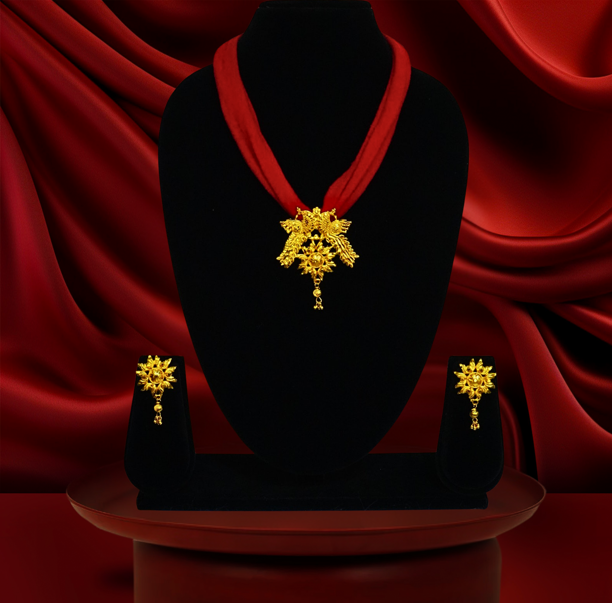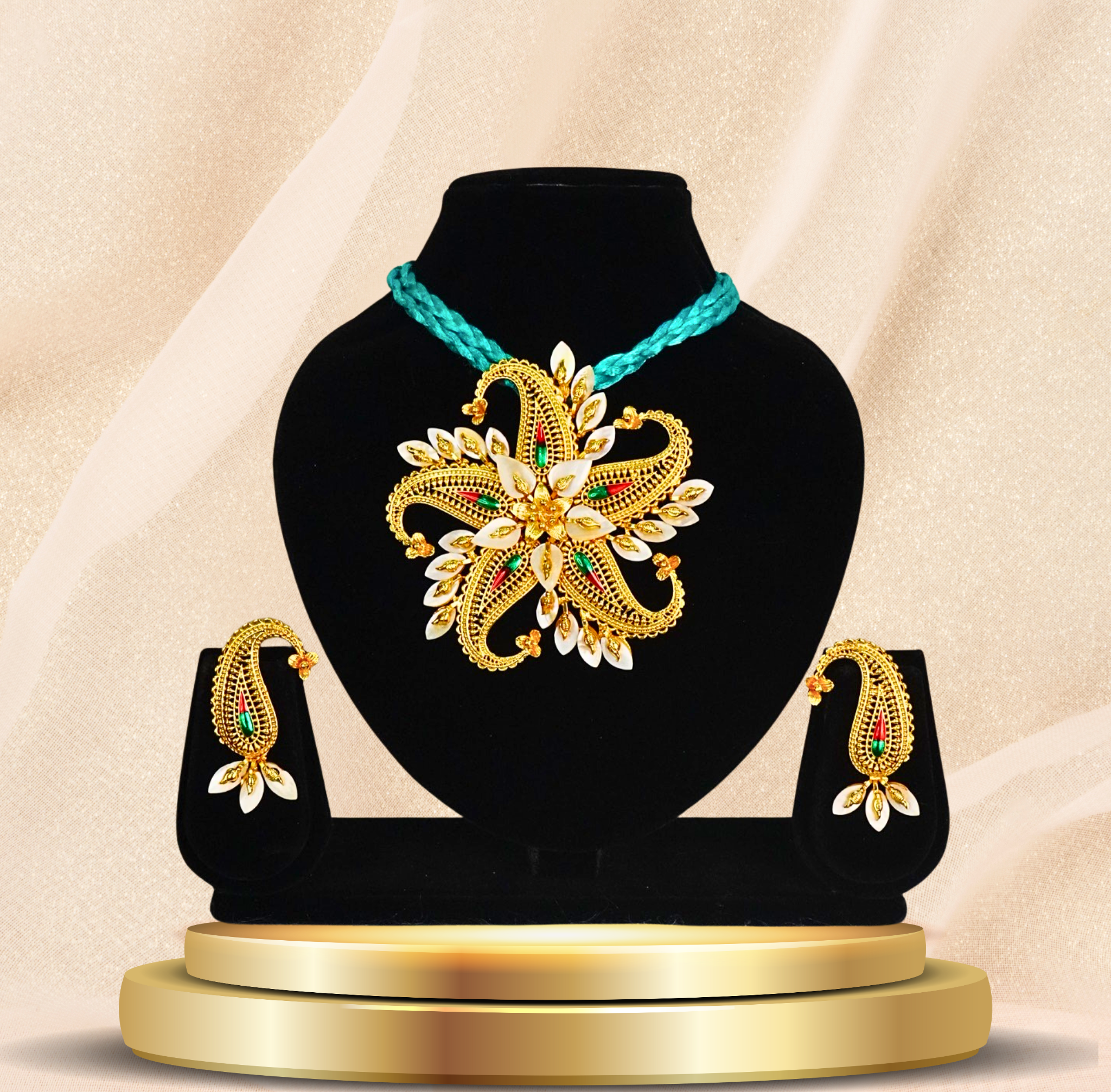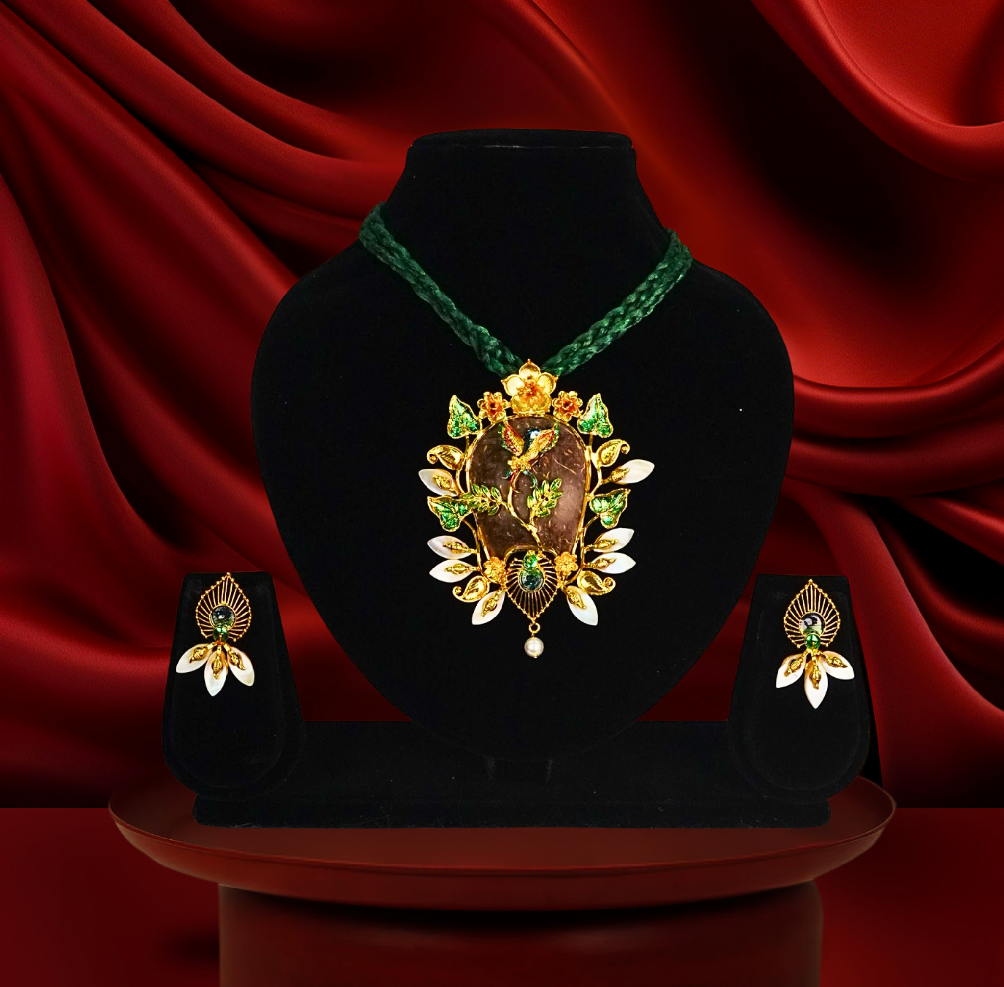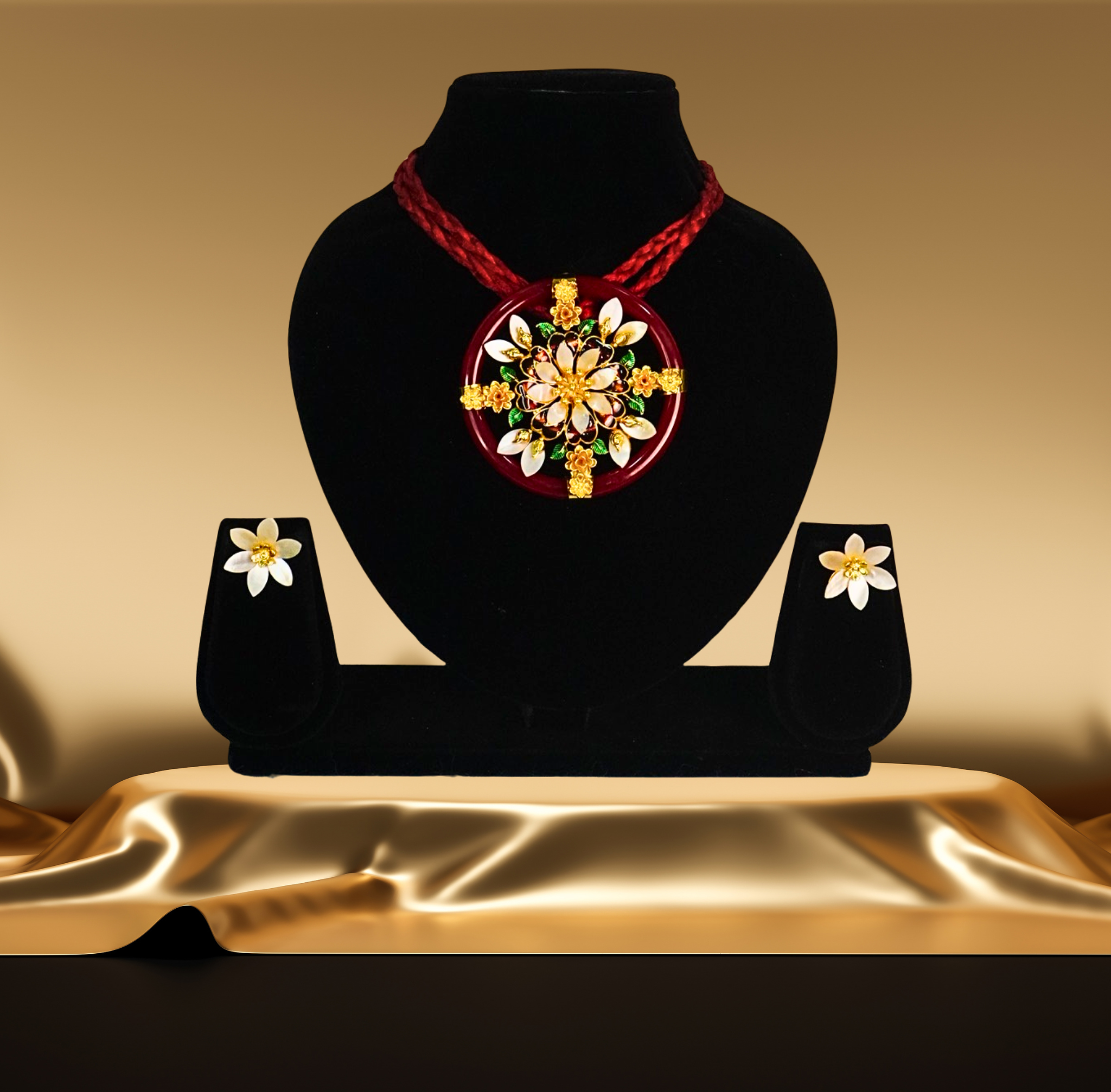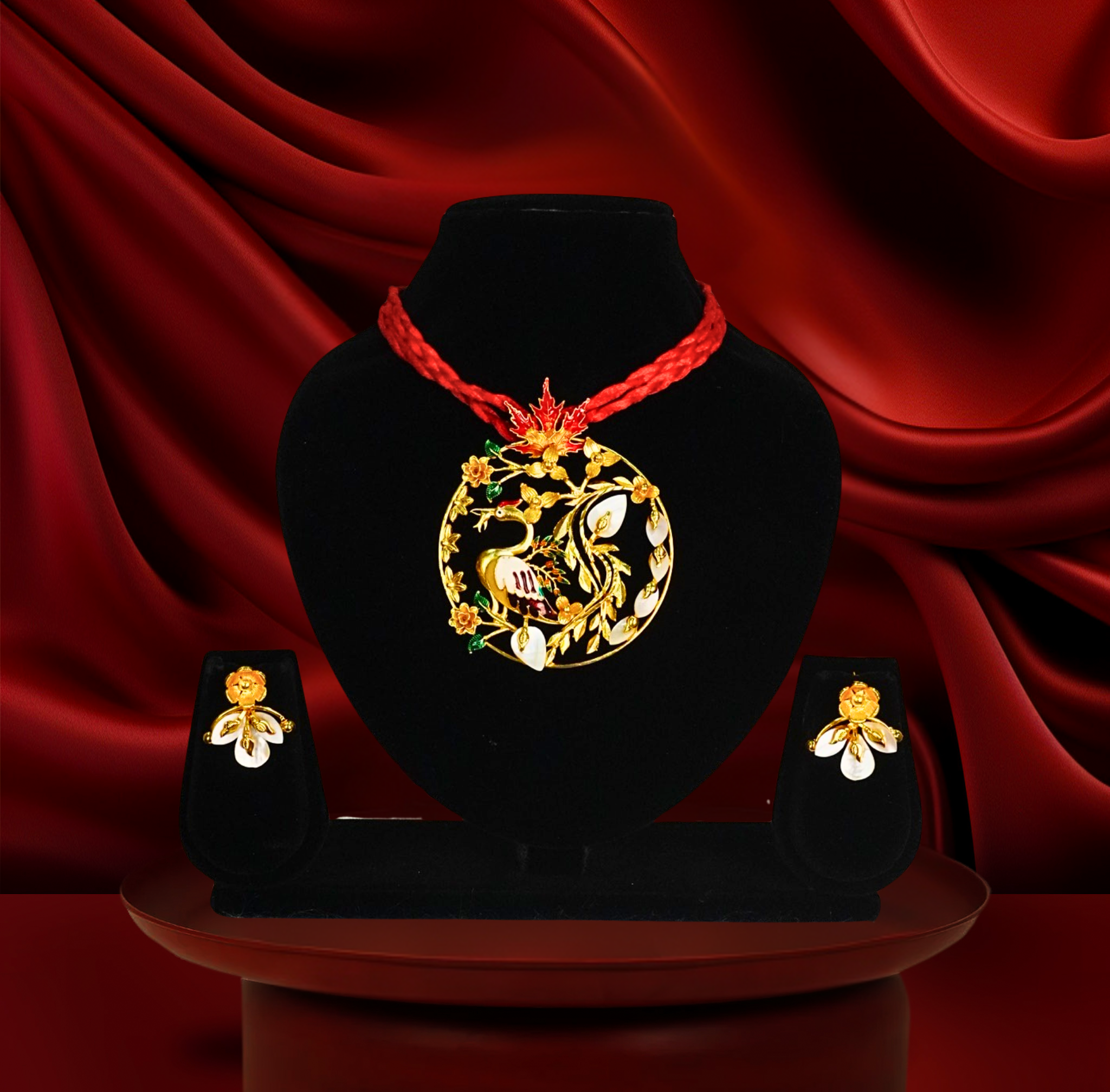 24k gold-plated red pola shell pendant set with earrings | traditional floral jewelry