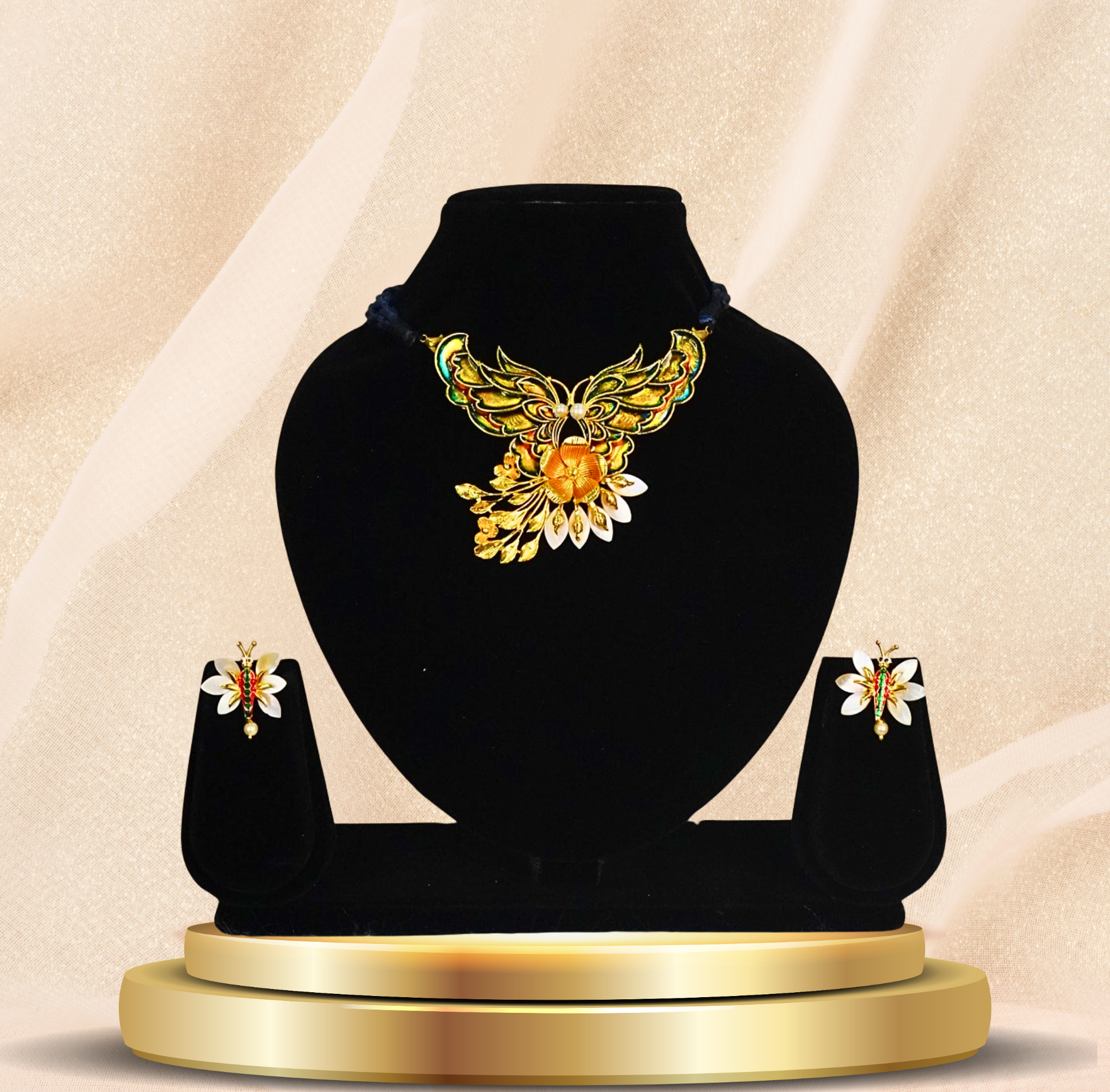 24kt gold-plated butterfly motif pendant set with floral earrings