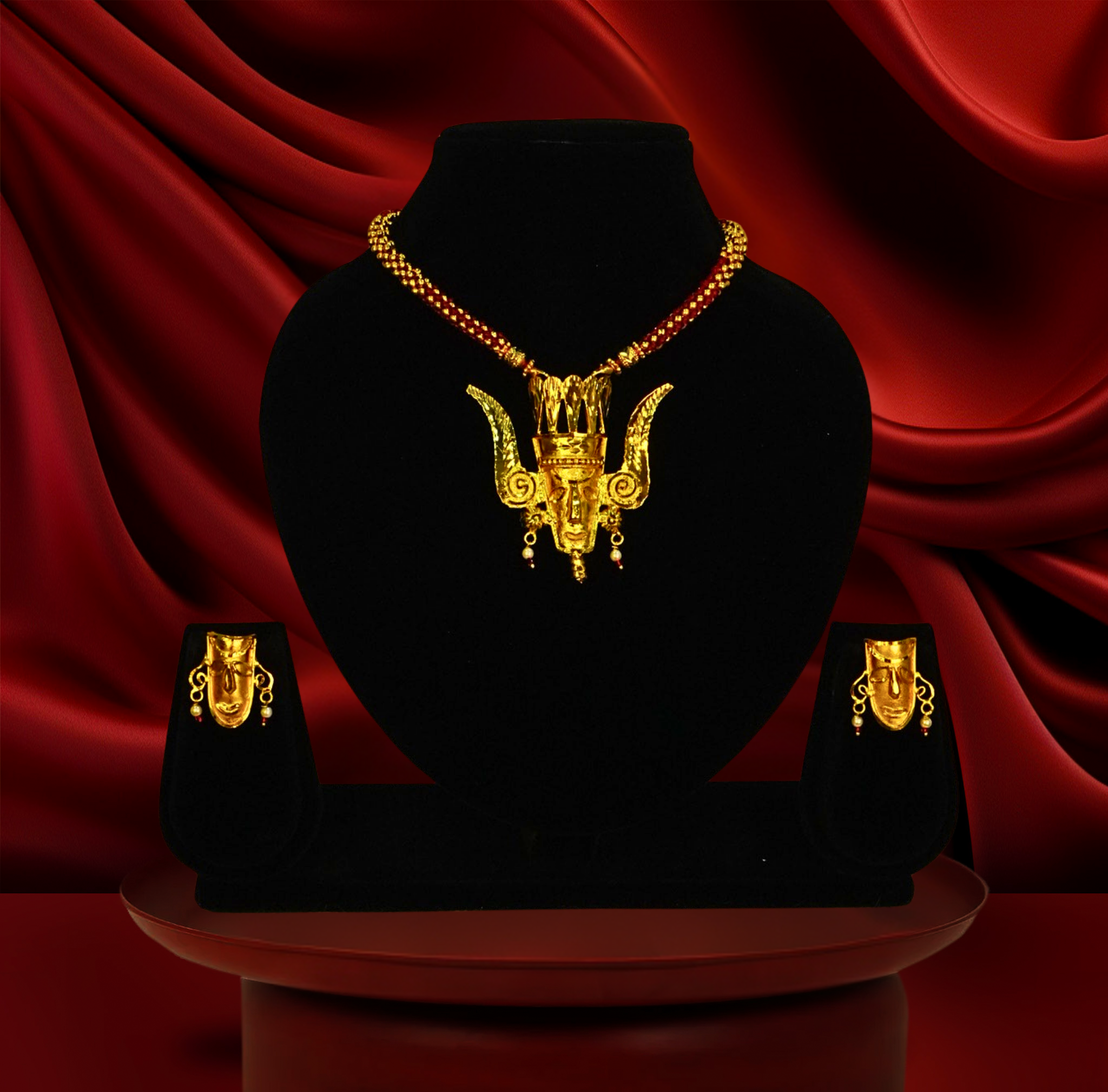 24k gold-plated tribal face motif pendant set – antique ethnic design with horn crown detailing