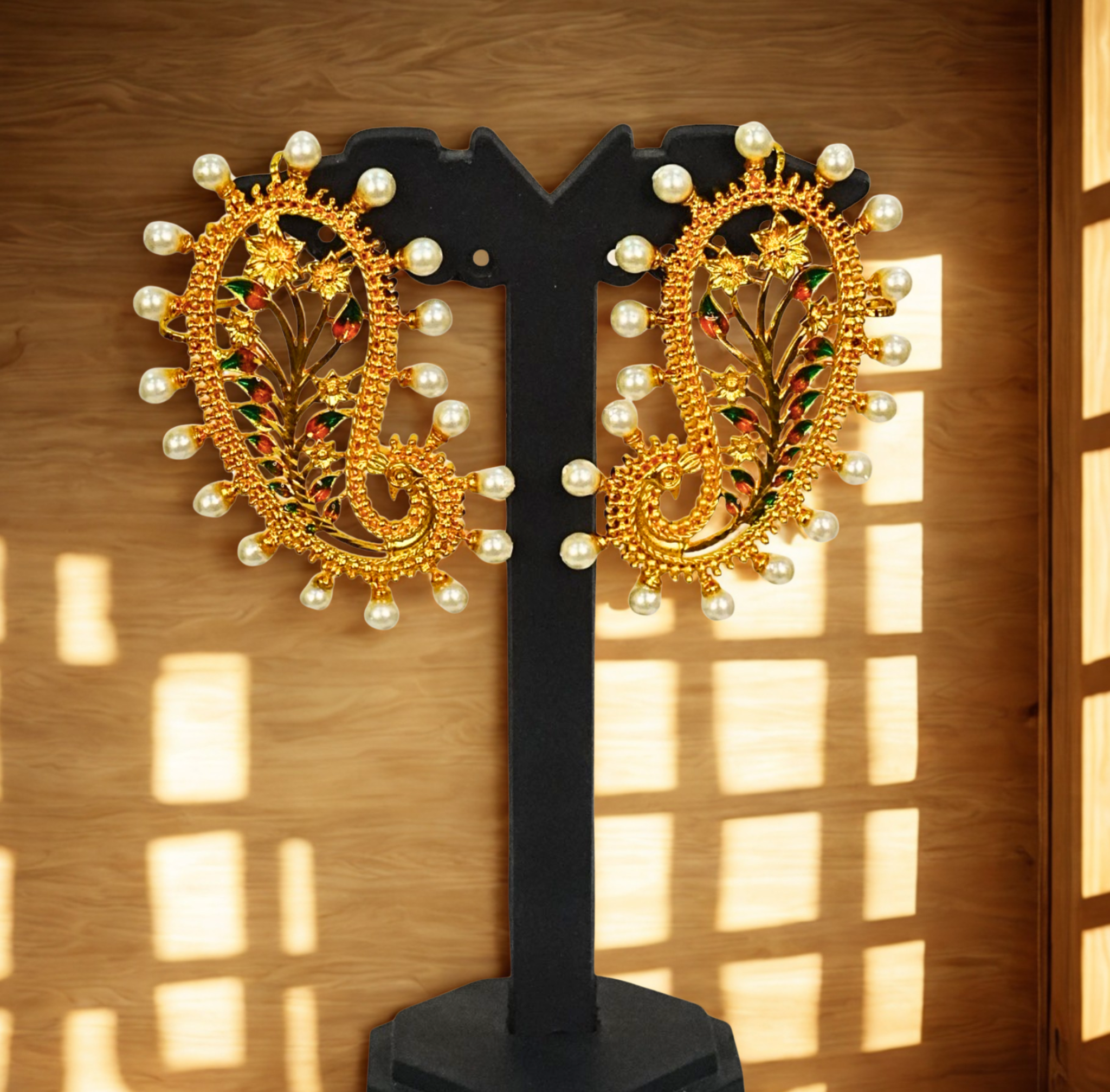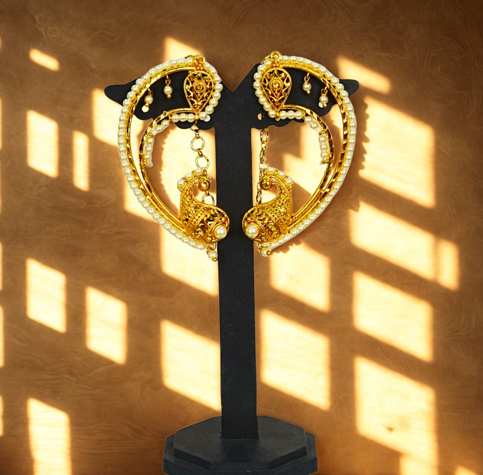 Unleash your inner queen with our handcrafted 24K Gold-Plated Pearl-Studded Peacock Full Kaan Earrings – Traditional Bengali Bridal Design. This elegant full kaan earring inspired by traditional Indian...