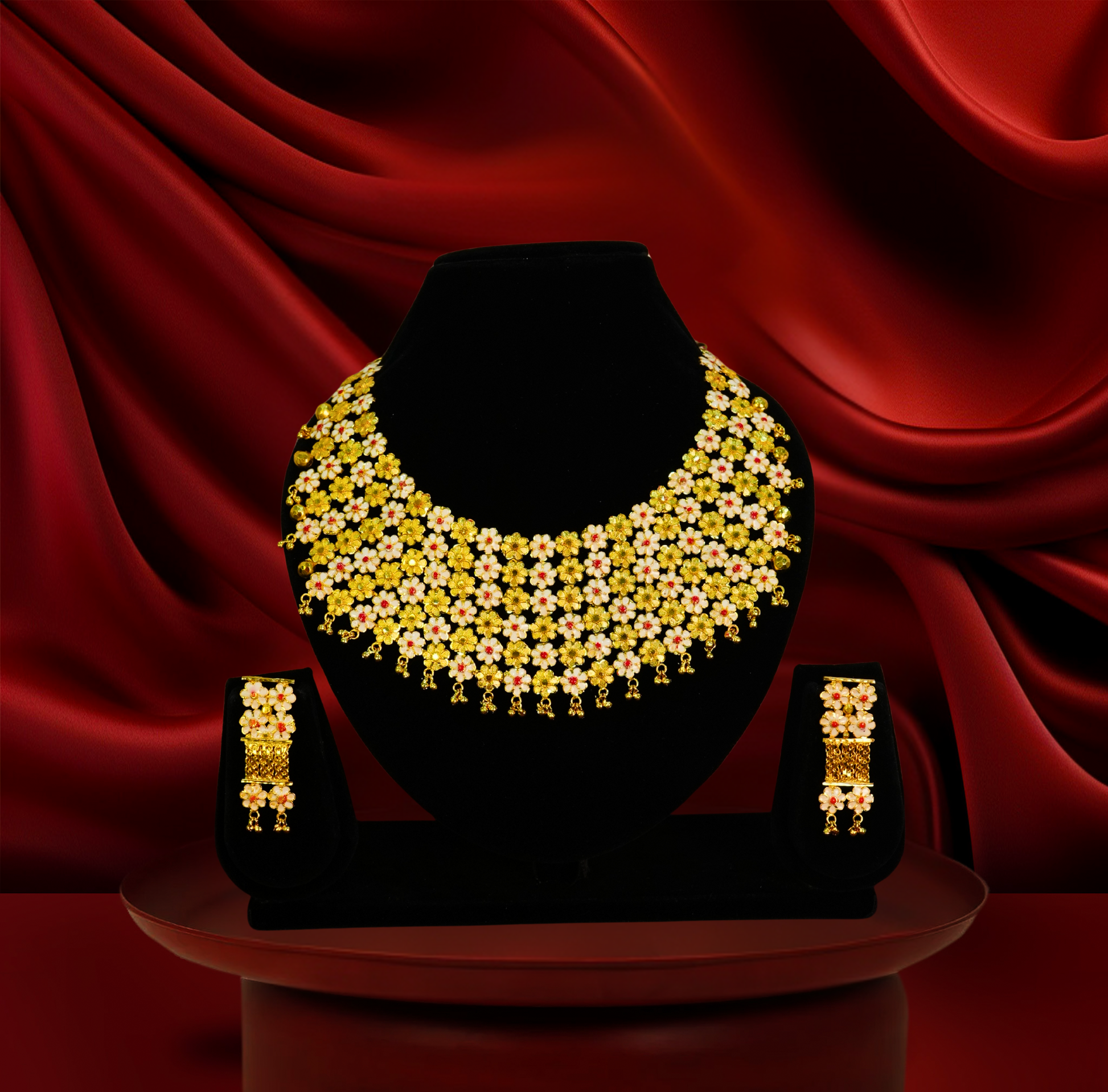Unleash your inner queen with our handcrafted 24K Gold-Plated - Six Layered Meenakari Shiuli Bridal Chatai Set with Earrings – Premium Costume Jewellery. This Elegant Necklace set inspired by traditional Indian craftsmanship, a true celebration of timeless elegance and royal charm. Designed for women who appreciate beauty with a luxurious soul, this exquisite piece is crafted on a pure copper base and lavishly plated with real 24K gold bar — offering the richness of gold without the heavy price tag.
